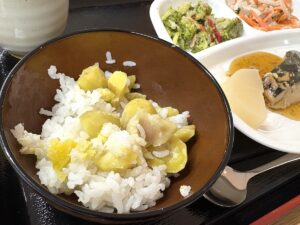 炊きあがる香りに、食堂には「いい匂いがするね」「秋やねえ」と笑顔の声が。 お膳に並んだ栗ご飯を見て、入居者様も