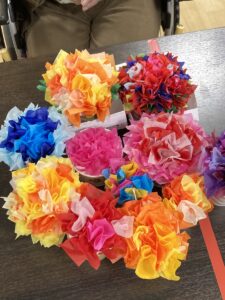 カップの種類や色は利用者様ご自身に選んでいただき、カップの中に用意した粘土の土台へ色紙を埋め込み、花びらを表現していく作業を行い、男性の利用者様も集中して取り組まれ、それぞれ個性あふれる素敵な作品が完成しました。