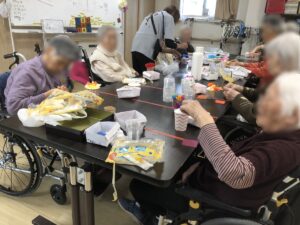創作活動のあとは、おやつの時間にフルーツ入り杏仁豆腐をご用意し、お好きな量をご自身でよそっていただく形式にしたところ、「もっとほしい」とのお声もあり、楽しく充実したひとときを過ごしていただけたようです。